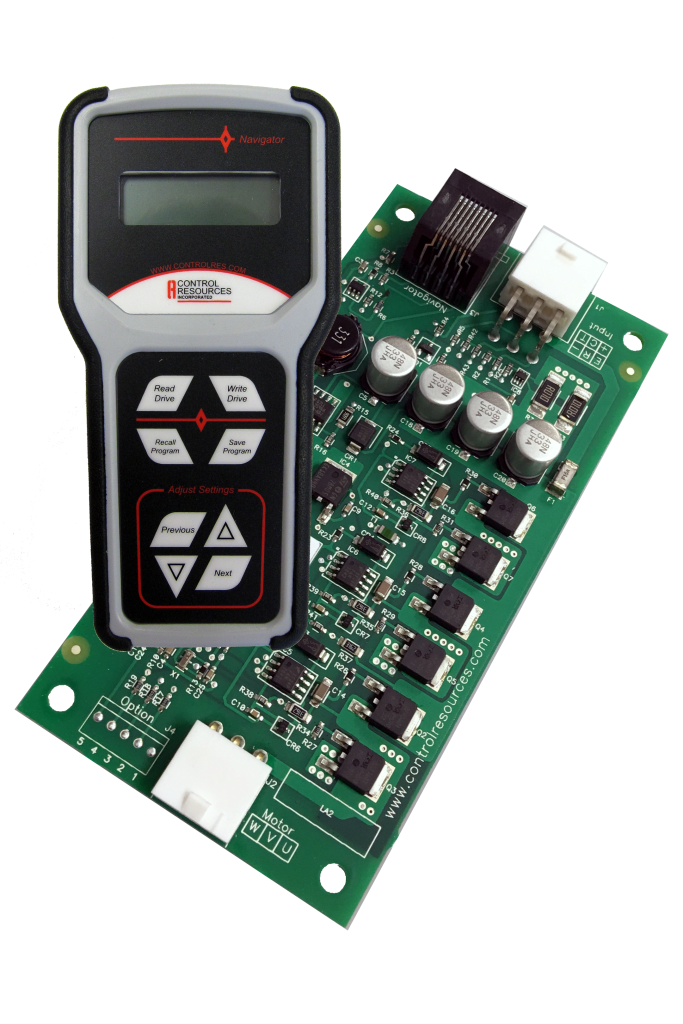 The Eddy-10 BLDC motor controller can be customized for your application using the Navigator hand-held programmer (pictured). The Navigator can be used to program up to 17 variables including fixed speed or controlling motor speed from a control input (up to 10VDC). Other Eddy-10/Navigator programming variables include motor speed range, motor pole count, current / torque limits, acceleration / deceleration rates and motor on / off set points.